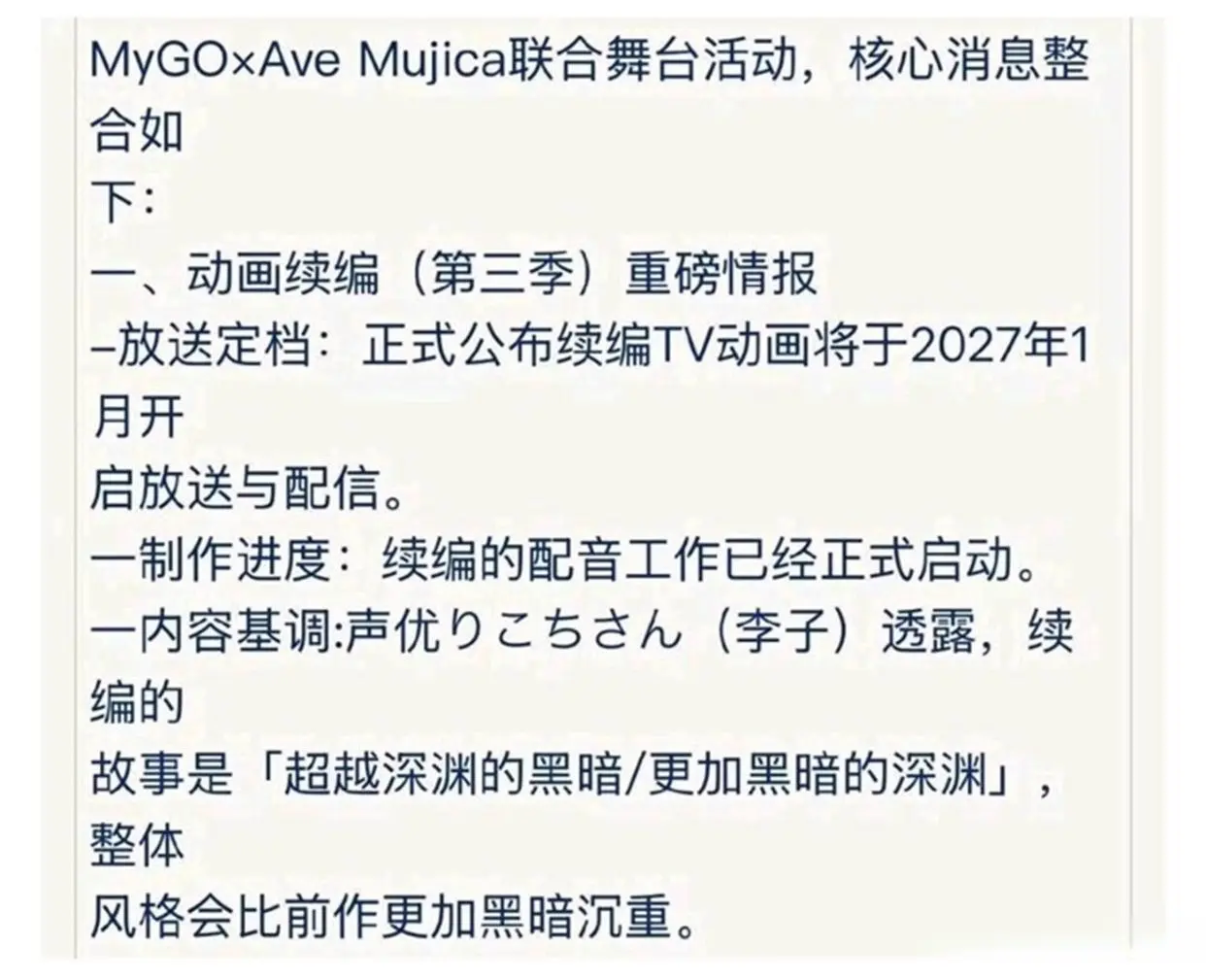 还有就是睦的精神状态,睦在前作最后已经崩过一次了,续作如果继续深挖她的心理创伤的话那画面我不敢想。声优访谈里用“深渊”这个词,搞不好真的会涉及到更沉重的心理描写,比如自毁倾向、人格分裂之类的,邦多利世界观能不能撑住这种剧情,我持保留意见。对这个消息反正我是又期待又害怕,你们呢觉得续作能有多黑?会不会最后发现祥子她姥爷才是幕后黑手?评论区聊聊。
